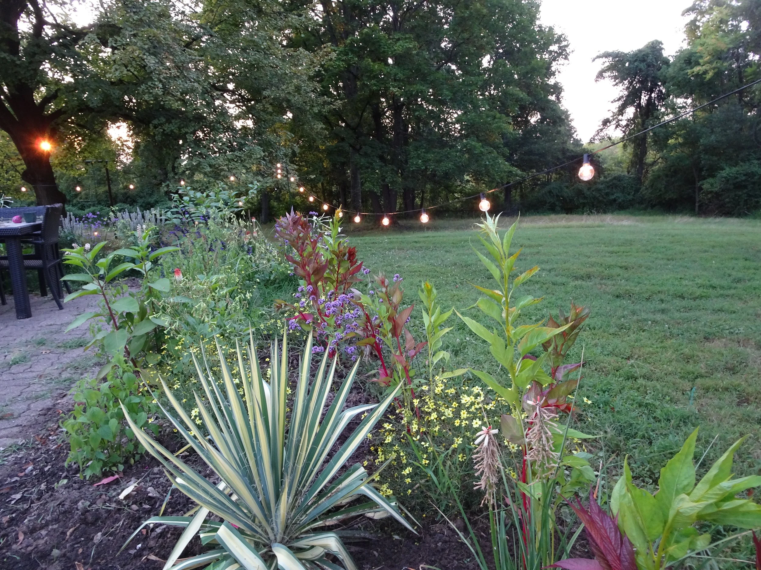 A lush planting that evokes a tropical escape. Garden blooms non-stop from early summer through the entire pool season.